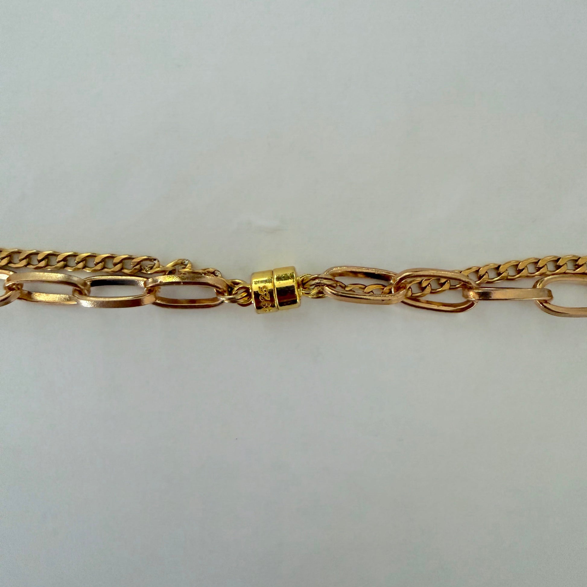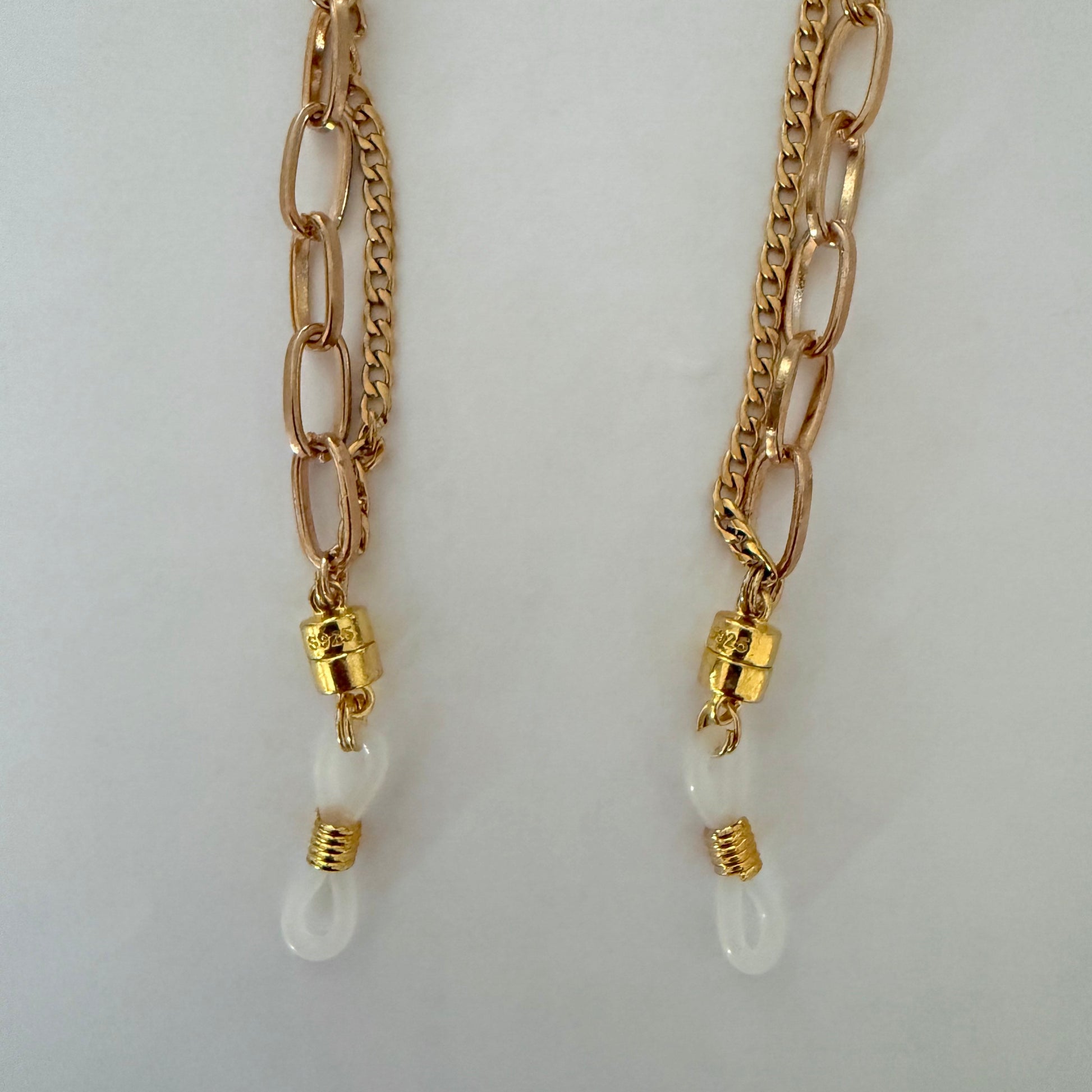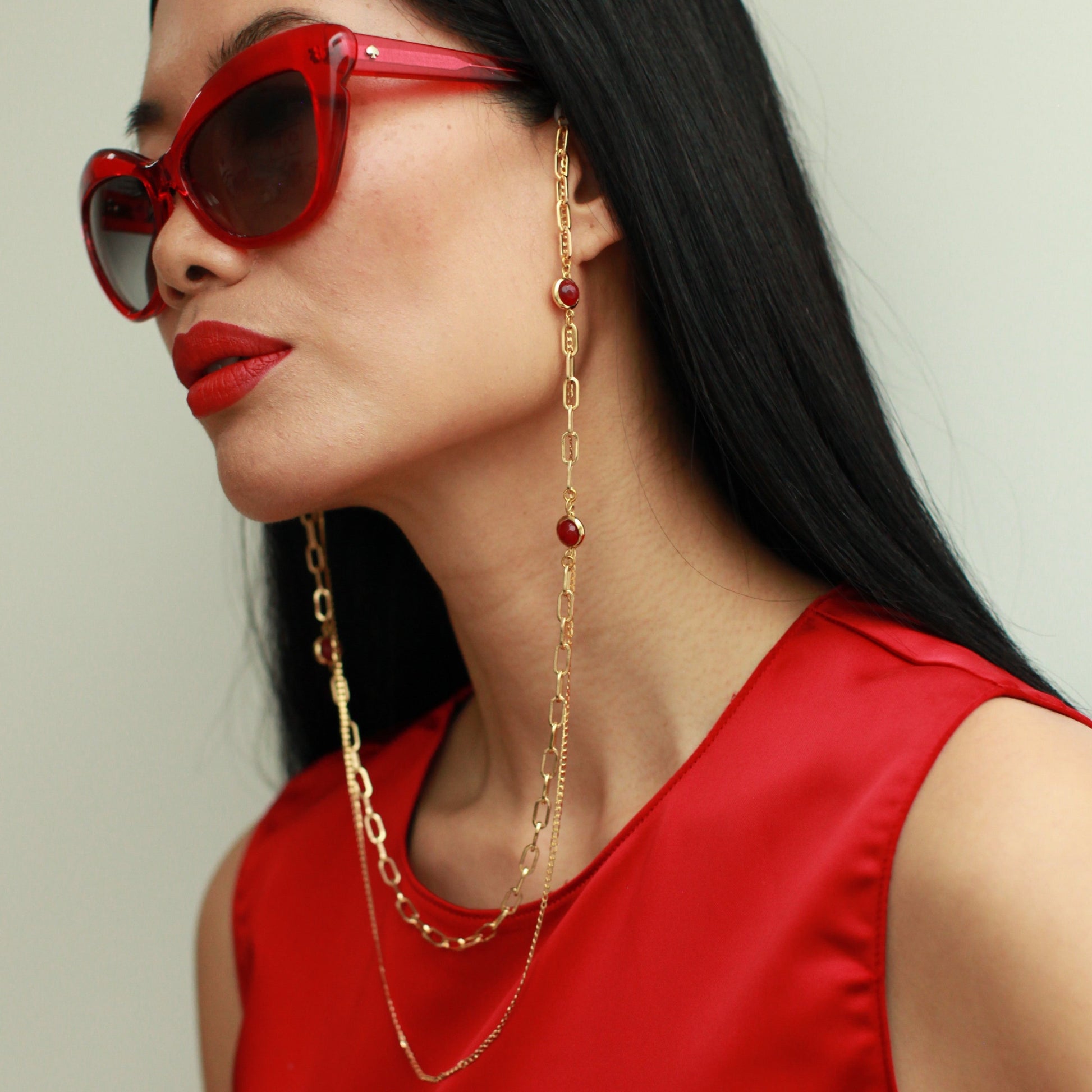 Gold plated paperclip and thin chains with red carnelian beads. The unique magnetic clasp on both sides allows you to quickly attach and detach from your glasses and use the chain as a necklace.