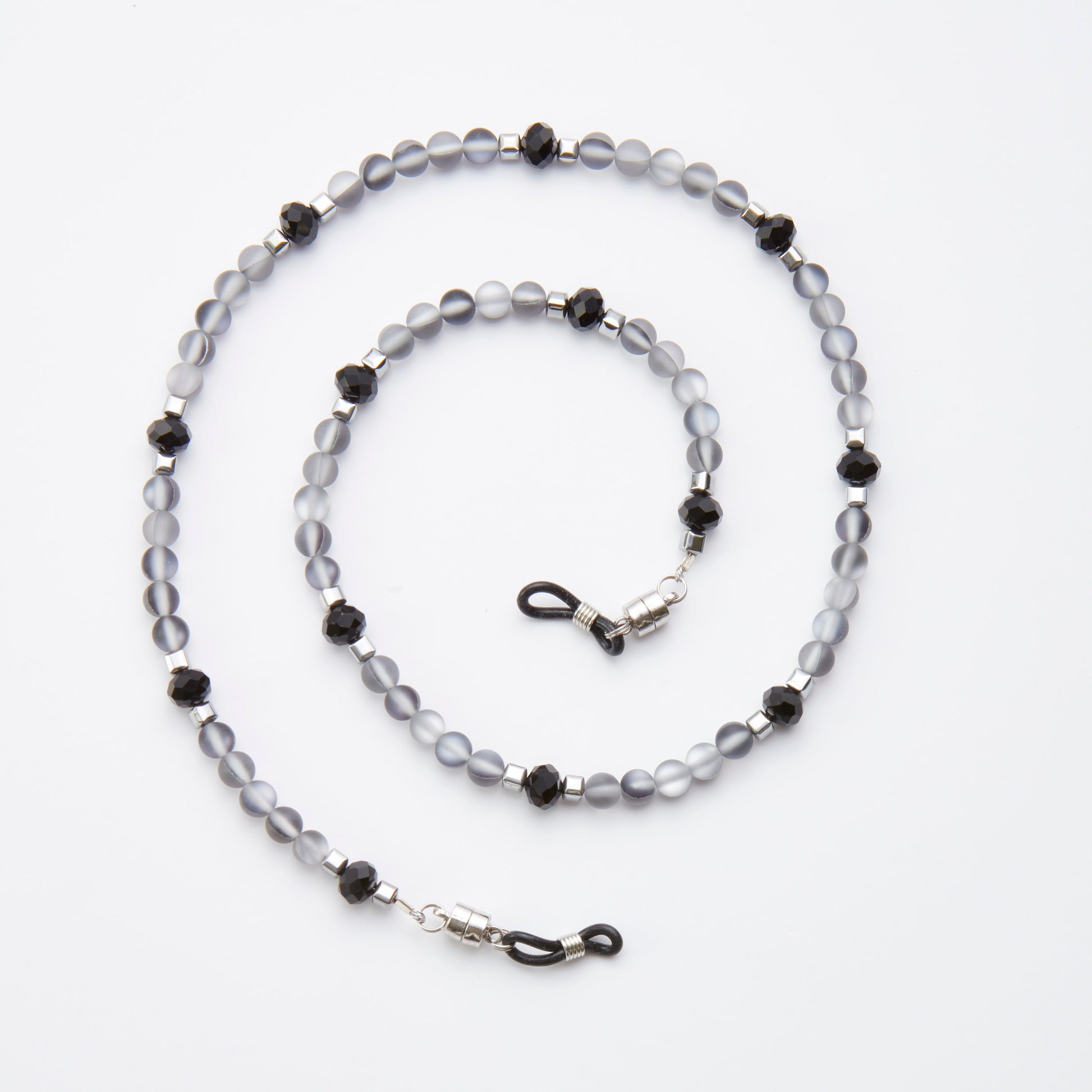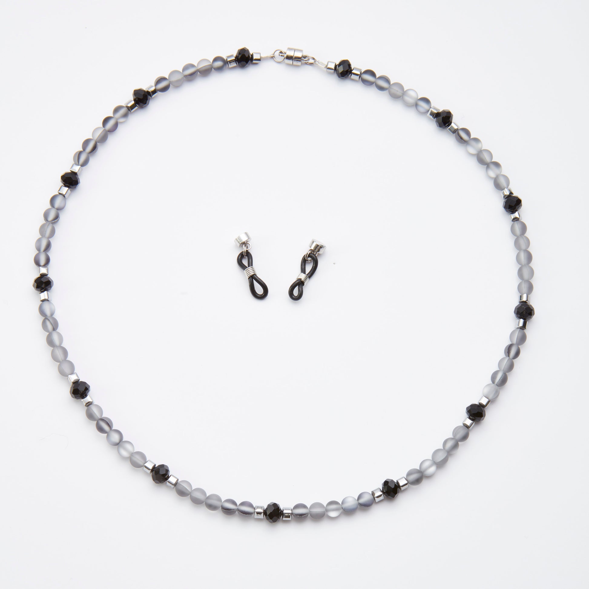 Smokey grey quartz simulated moonstone beads with black agate and hematite. The unique magnetic clasp on both sides allows you to quickly attach and detach from your glasses and use the chain as a necklace. Also works as a wraparound bracelet on some wrists.